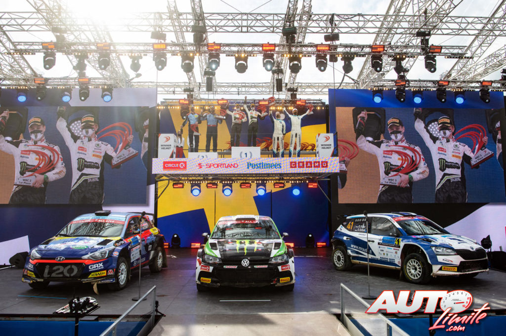 Oliver Solberg (Volkswagen), Jari Huttunen (Hyundai) y Egon Kaur (Skoda) subidos en el podio del Rally de Estonia 2020, en la categoría WRC 3.