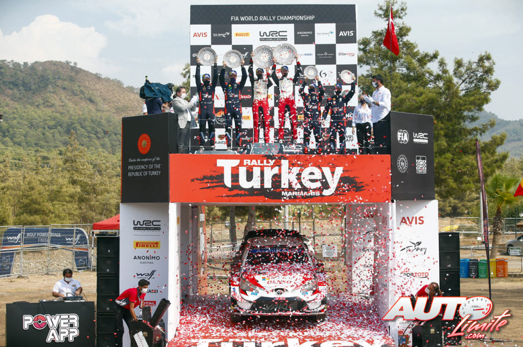 Elfyn Evans (Toyota), Thierry Neuville (Hyundai) y Sébastien Loeb (Hyundai) subidos en el podio absoluto del Rally de Turquía 2020, en la categoría WRC.