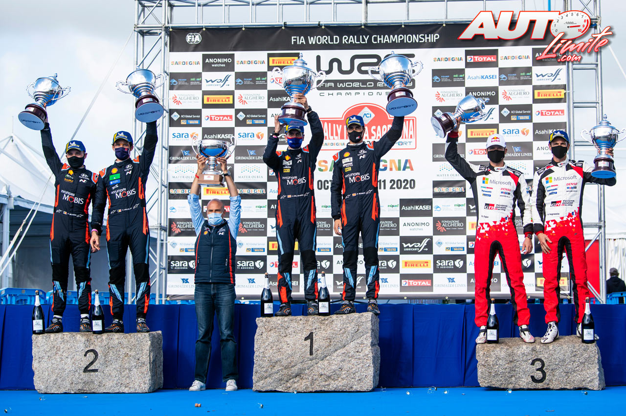 Podio del Rally de Italia / Cerdeña 2020, puntuable para el Campeonato del Mundo de Rallies 2020. De izquierda a derecha: Nicolas Gilsoul y Thierry Neuville (Hyundai), Carlos del Barrio con Dani Sordo (Hyundai) y Sébastien Ogier junto a Julien Ingrassia (Toyota).