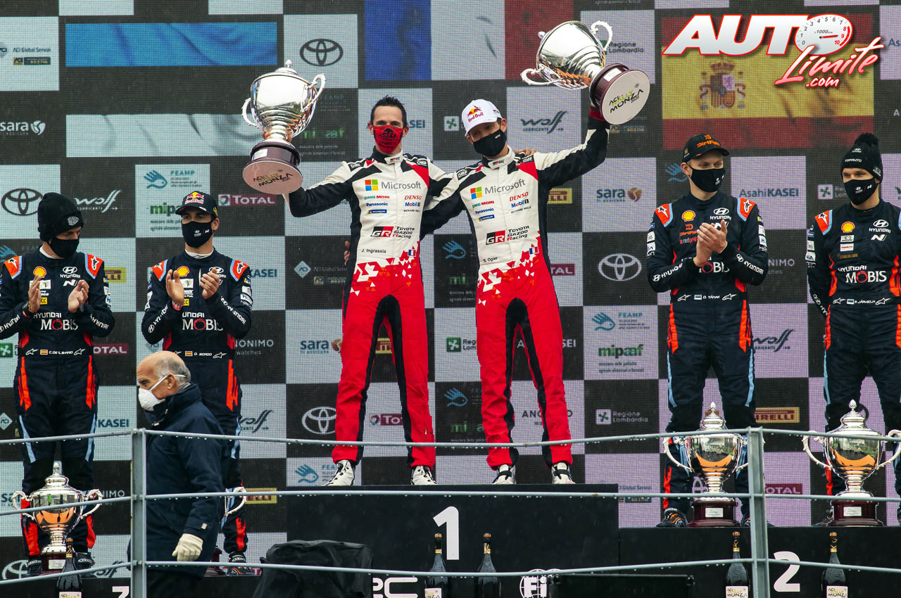 Podio del Rally de Monza 2020, puntuable para el Campeonato del Mundo de Rallies 2020. De izquierda a derecha: Carlos del Barrio y Dani Sordo (Hyundai), Julen Ingrassia con Sébastien Ogier (Toyota) y Ott Tänak junto a Martin Järveoja (Hyundai).