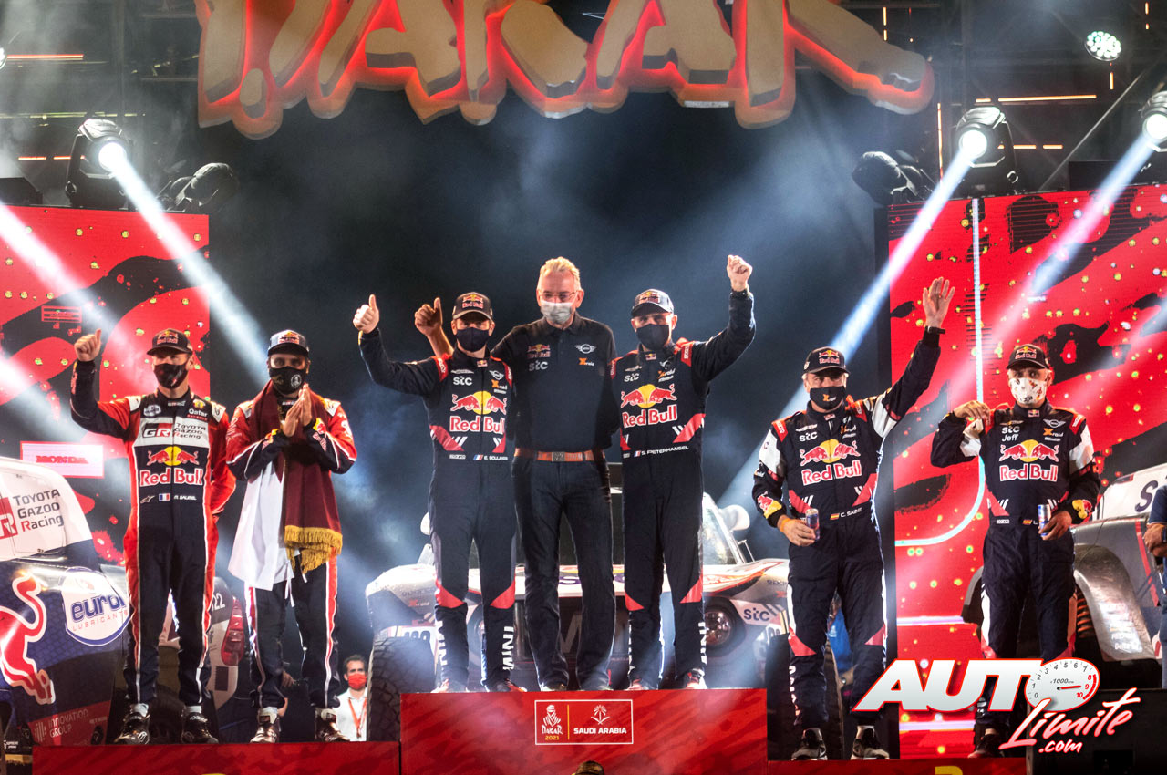 Podio de la categoría de coches del Rally Dakar 2021. De izquierda a derecha: Matthieu Baumel y Nasser Al-Attiyah (Toyota), Edouard Boulanger, Sven Quandt (CEO de X-Raid) y Stéphane Peterhansel (MINI), junto a Carlos Sainz con Lucas Cruz (MINI).