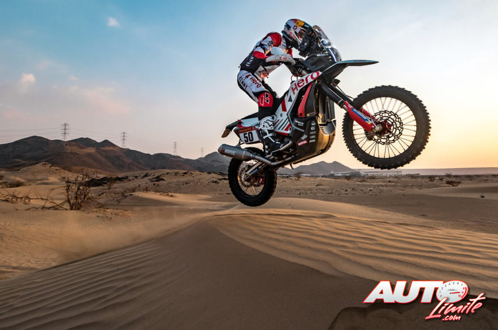 Santosh Chunchunguppe Shivashankar, a los mandos de su Hero 450 Rally, durante una etapa del Rally Dakar 2021.