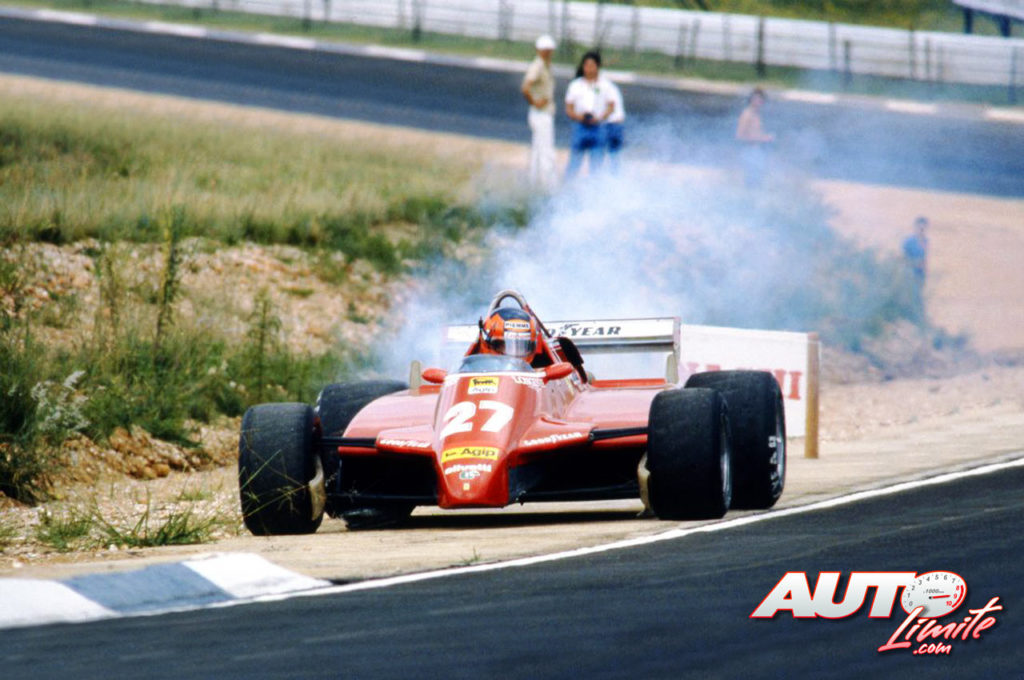 Gilles Villeneuve, al volante del Ferrari 126 C2, durante el GP de Sudáfrica 1982, disputado en el circuito de Kyalami. El piloto canadiense se debía retirar al sufrir una avería en el motor.
