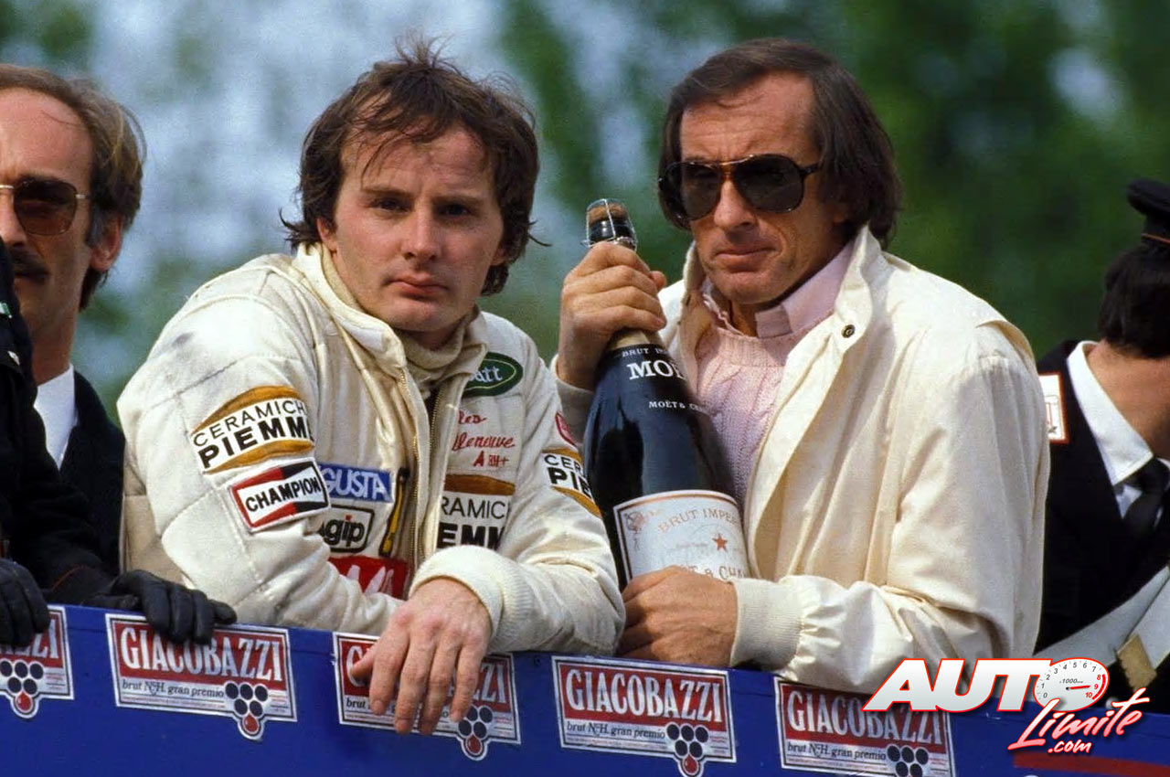 Gilles Villeneuve junto a Jackie Stewart, tras la celebración del podio del GP de San Marino 1982, disputado en el Autódromo Dino Ferrari de Imola (Italia). El piloto canadiense estaba tremendamente decepcionado tras lo que él consideraba una traición de su compañero de equipo, Didier Pironi, que fue el vencedor de la prueba.