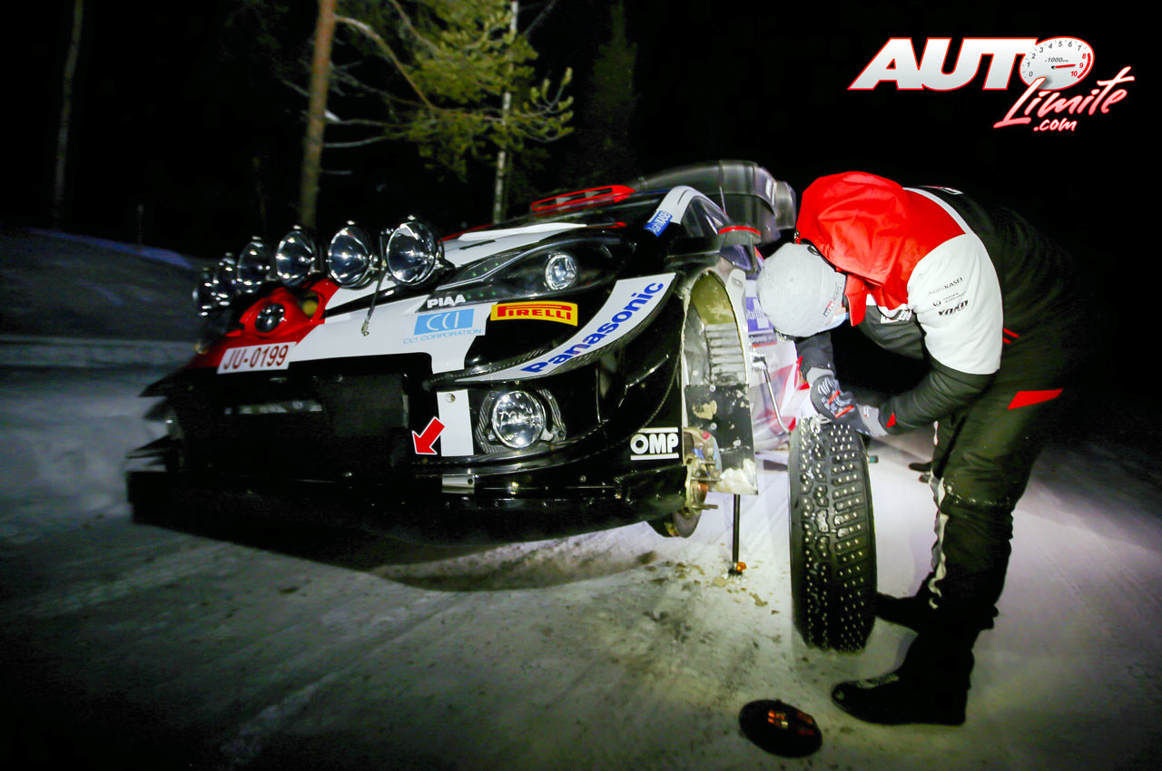 Elfyn Evans cambiando los neumáticos de clavos de su Toyota Yaris WRC durante el Rally Ártico de Finlandia 2021, puntuable para el Campeonato del Mundo de Rallies WRC.