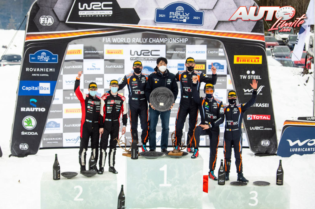 Podio del Rally Ártico de Finlandia 2021, puntuable para el Campeonato del Mundo de Rallies WRC 2021. De izquierda a derecha: Jonne Halttunen y Kalle Rovanperä (Toyota), Martin Järveoja con Scott Noh (Presidente de Hyundai Motorsport) y Ott Tänak (Hyundai) y Thierry Neuville junto a Martijn Wydaeghe (Hyundai).