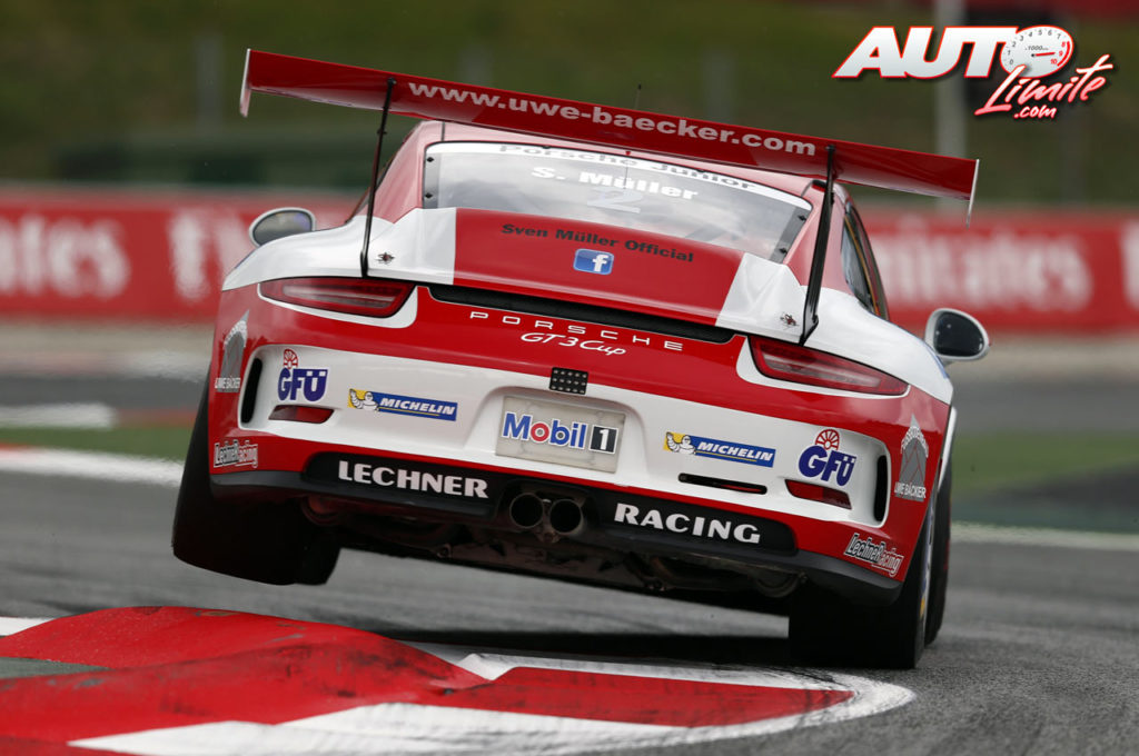 Sven Müller, al volante del Porsche 911 GT3 Cup, durante una prueba de la copa internacional "Porsche Supercup" 2016, disputada en el Circuito de Montmeló (España).