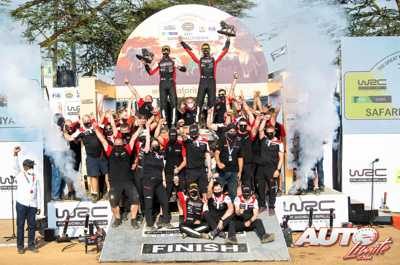 El equipo Toyota Gazoo Racing WRT celebrando la victoria de Sébastien Ogier en el podio del Rally Safari de Kenia 2021, puntuable para el Campeonato del Mundo de Rallies WRC.