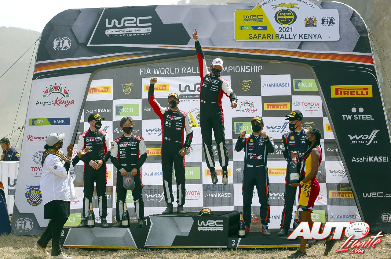 Podio del Rally Safari de Kenia 2021, puntuable para el Campeonato del Mundo de Rallies WRC 2021. De izquierda a derecha: Daniel Barritt y Takamoto Katsuta (Toyota), Julien Ingrassia con Sébastien Ogier (Toyota) y Martin Järveoja junto a Ott Tänak (Hyundai).