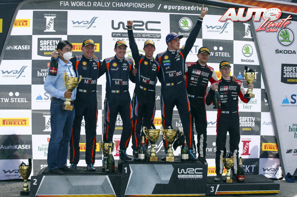 Podio del Rally de Bélgica 2021, puntuable para el Campeonato del Mundo de Rallies WRC 2021. De izquierda a derecha: Scott Noh (Presidente de Hyundai Motorsport), Paul Nagle y Craig Breen (Hyundai), Martijn Wydaeghe con Thierry Neuville (Hyundai) y Jonne Halttunen junto a Kalle Rovanperä (Toyota).