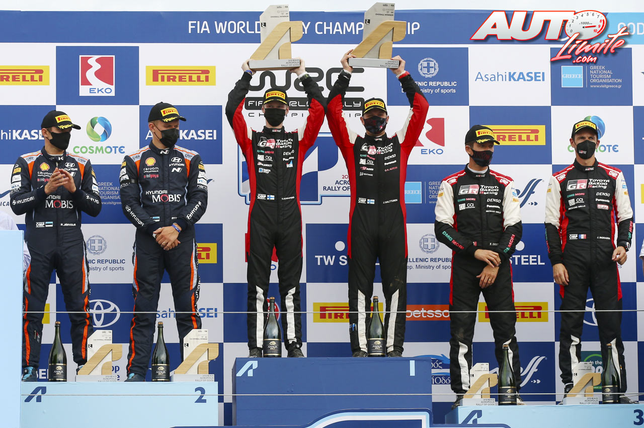 Podio del Rally de Grecia 2021, puntuable para el Campeonato del Mundo de Rallies WRC 2021. De izquierda a derecha: Martin Järveoja y Ott Tänak (Toyota), Kalle Rovanperä con Jonne Halttunen (Toyota) y Sébastien Ogier junto a Julien Ingrassia (Toyota).