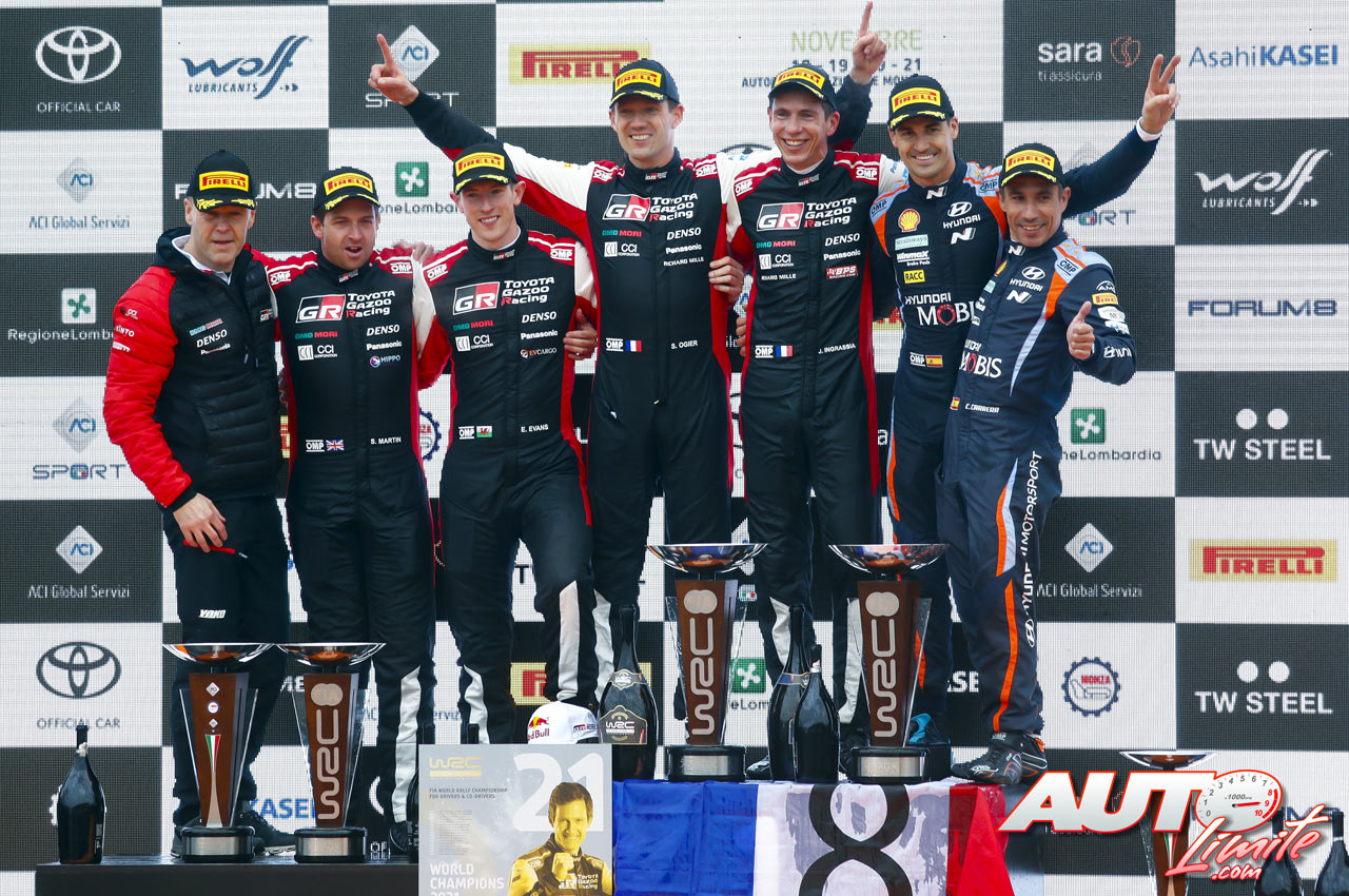 Podio del Rally de Monza 2021, última prueba puntuable para el Campeonato del Mundo de Rallies 2021. De izquierda a derecha: Kaj Lindström (Director Técnico de Toyota Gazoo Racing WRT), Scott Martin y Elfyn Evans (Toyota), Sébastien Ogier con Julien Ingrassia (Toyota) y Dani Sordo junto a Cándido Carrera (Hyundai).