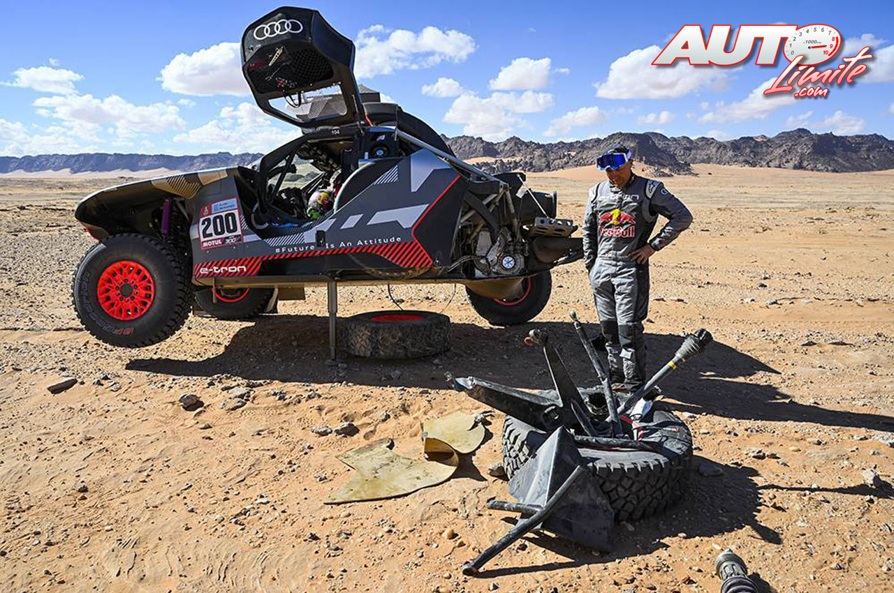 Stéphane Peterhansel, solucionando los problemas mecánicos de su Audi RS Q e-tron, durante una etapa del Rally Dakar 2022.