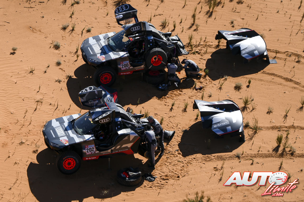 Stéphane Peterhansel y Carlos Sainz, solucionando los problemas mecánicos de sus Audi RS Q e-tron, durante una etapa del Rally Dakar 2022.