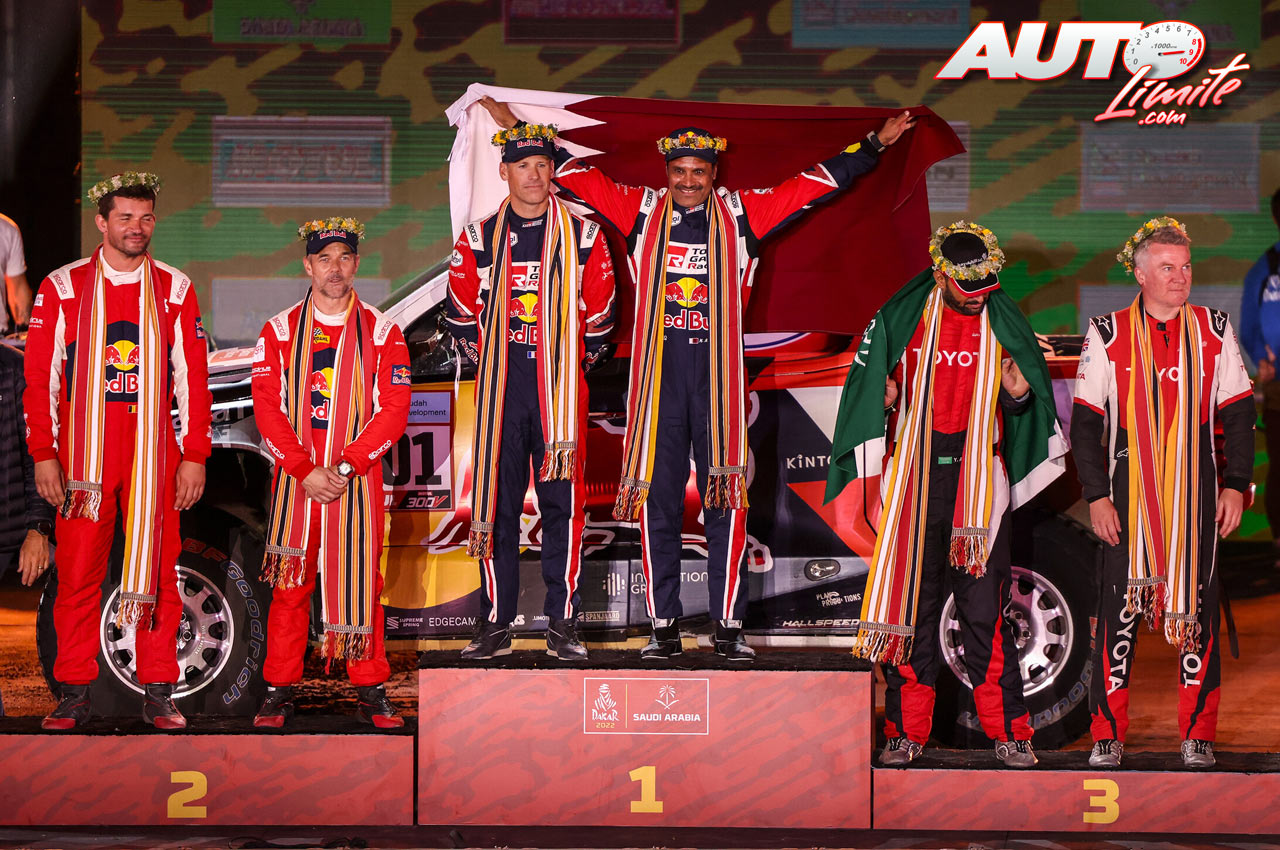 Podio de la categoría de coches del Rally Dakar 2022. De izquierda a derecha: Fabian Lurquin y Sébastien Loeb (BRX), Matthieu Baumel con Nasser Al-Attiyah (Toyota) y Yazeed Al Rajhi junto a Michael Orr (Toyota).