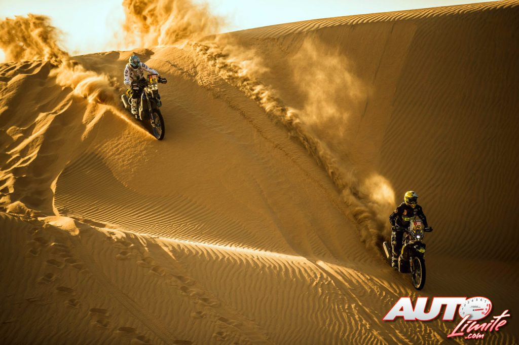 Adrien Van Beveren (Yamaha WR450F nº 42) y Stefan Svitko (KTM 450 Factory Rally Replica nº 142) sorteando una duna durante una etapa del Rally Dakar 2022.