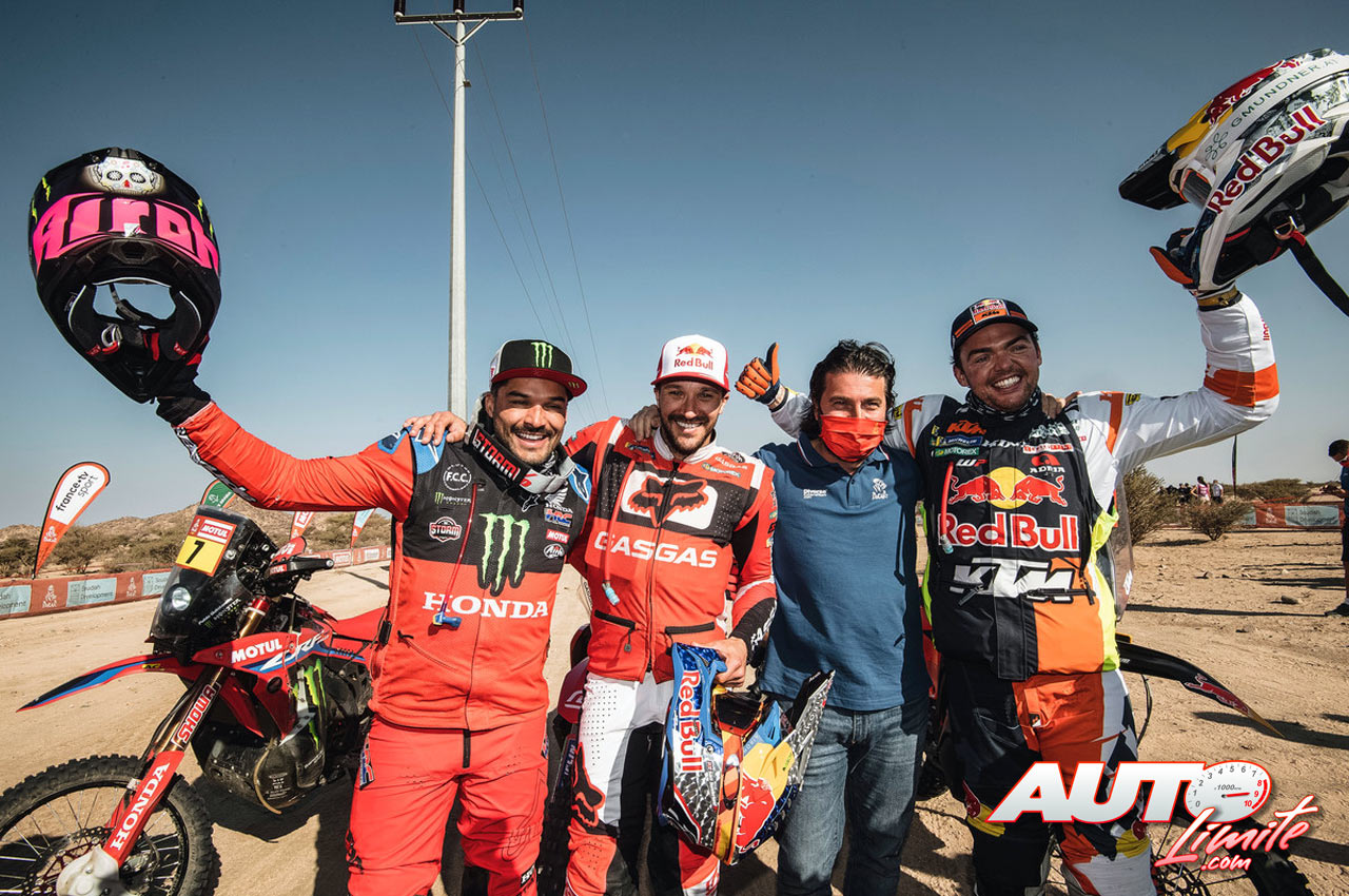 Los tres primeros clasificados de la categoría de motos lo celebraban al finalizar la última etapa del Rally Dakar 2022. De izquierda a derecha: Pablo Quintanilla (Honda), Sam Sunderland (GasGas), David Castera (Director del Dakar) y Matthias Walkner (KTM).