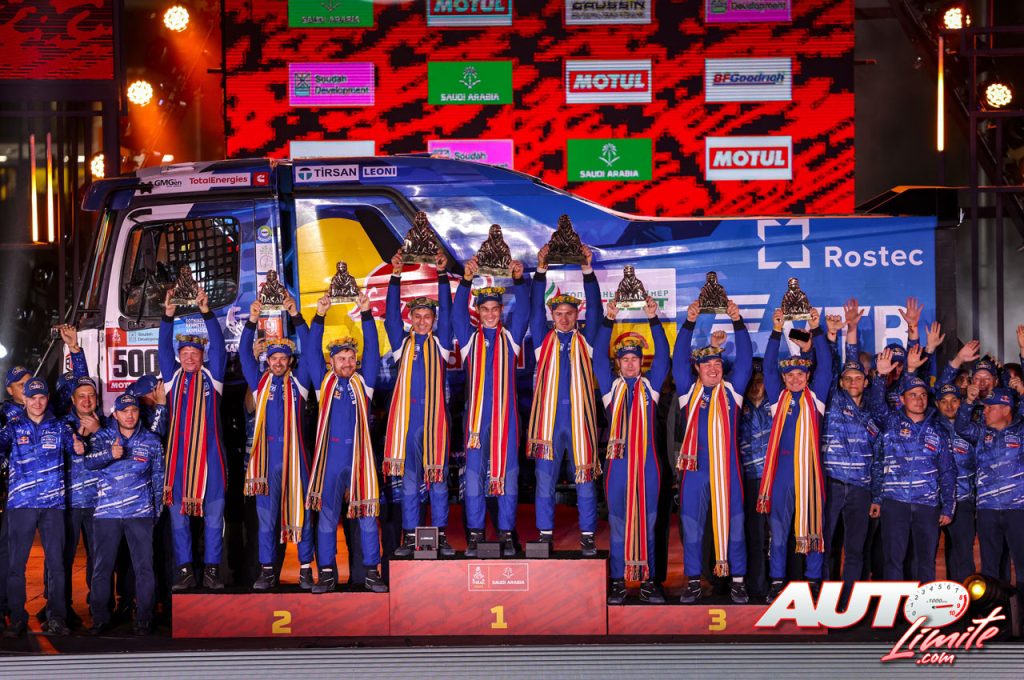Dmitry Sotnikov (Kamaz), Eduard Nikolaev (Kamaz) y Anton Shibalov (Kamaz), con sus respectivos compañeros, ocupaban las tres primeras posiciones del podio de camiones en el Rally Dakar 2022.