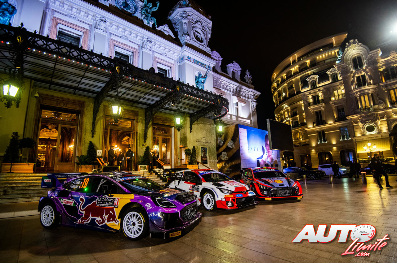 Ford Puma Rally1, Toyota Yaris Rally1 y Hyundai i20 N Rally1 antes de tomar la salida en el Rally de Montecarlo 2022, donde se estrenaban los nuevos coches híbridos de la máxima categoría Rally1.