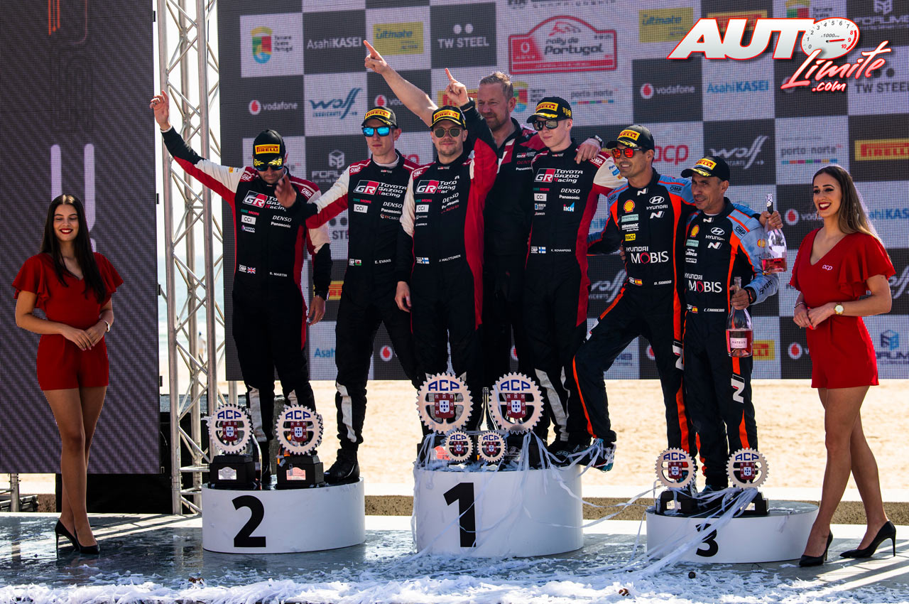 Podio del Rally de Portugal 2022, puntuable para el Campeonato del Mundo de Rallies WRC 2022. De izquierda a derecha: Scott Martin y Elfyn Evans (Toyota), Jonne Halttunen y Kaj Lindström (Director Deportivo de Toyota GR WRT) con Kalle Rovanperä (Toyota) y Dani Sordo junto a Cándido Carrera (Hyundai).