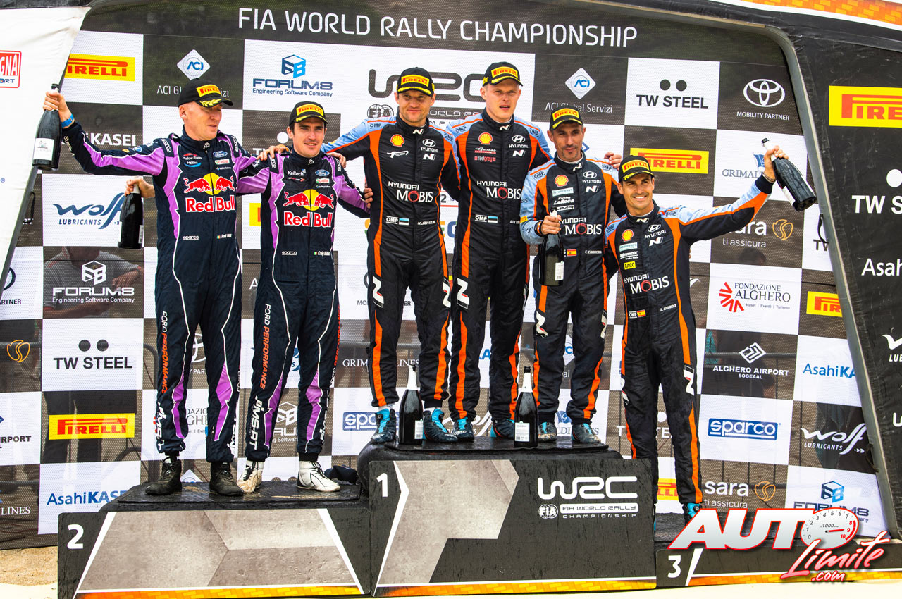 Podio del Rally de Italia – Cerdeña 2022, puntuable para el Campeonato del Mundo de Rallies WRC 2022. De izquierda a derecha: Paul Nagle y Craig Breen (Ford), Martin Järveoja con Ott Tänak (Hyundai) y Cándido Carrera junto a Dani Sordo (Hyundai).