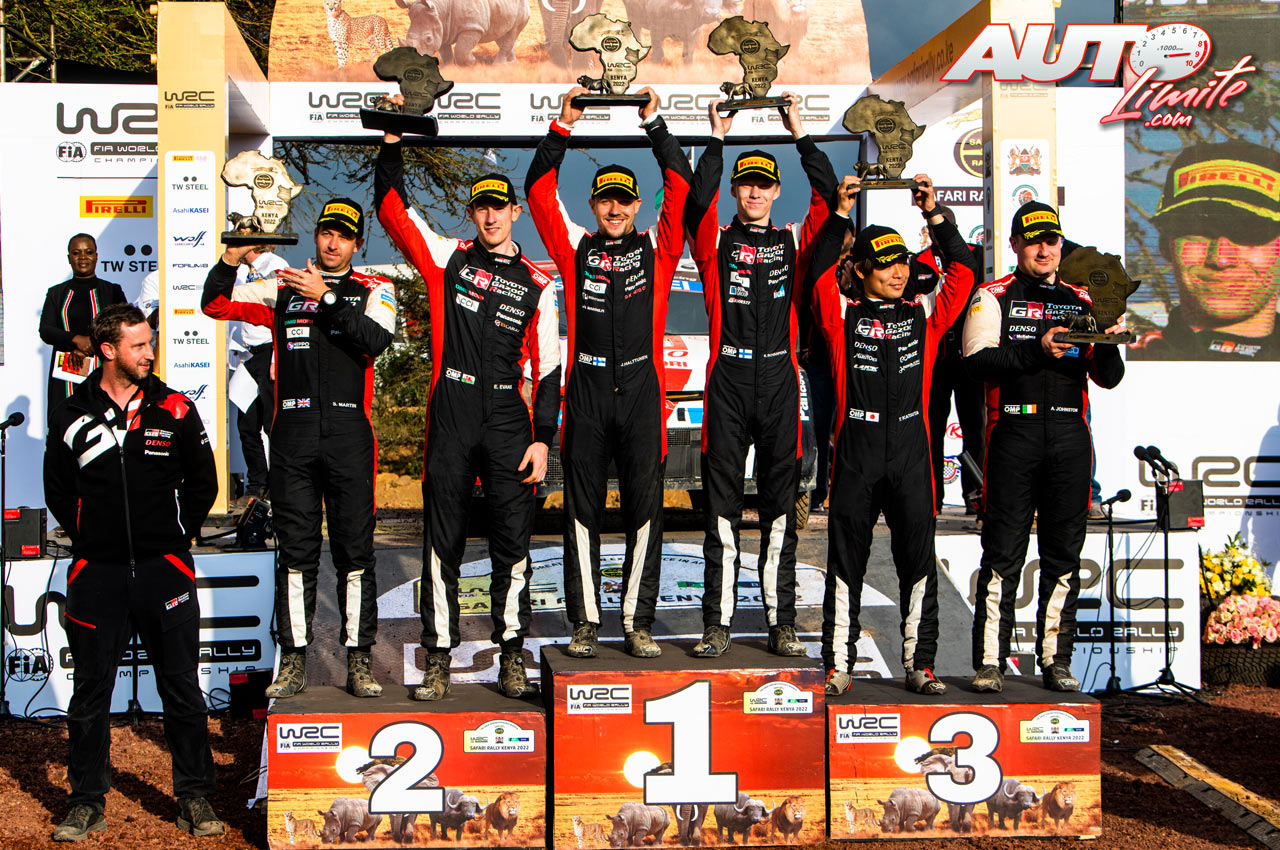 Podio del Rally Safari de Kenia 2022, puntuable para el Campeonato del Mundo de Rallies WRC 2022. De izquierda a derecha: Scott Martin y Elfyn Evans (Toyota), Jonne Halttunen con Kalle Rovanperä (Toyota) y Takamoto Katsuta junto a Aaron Johnston (Toyota).