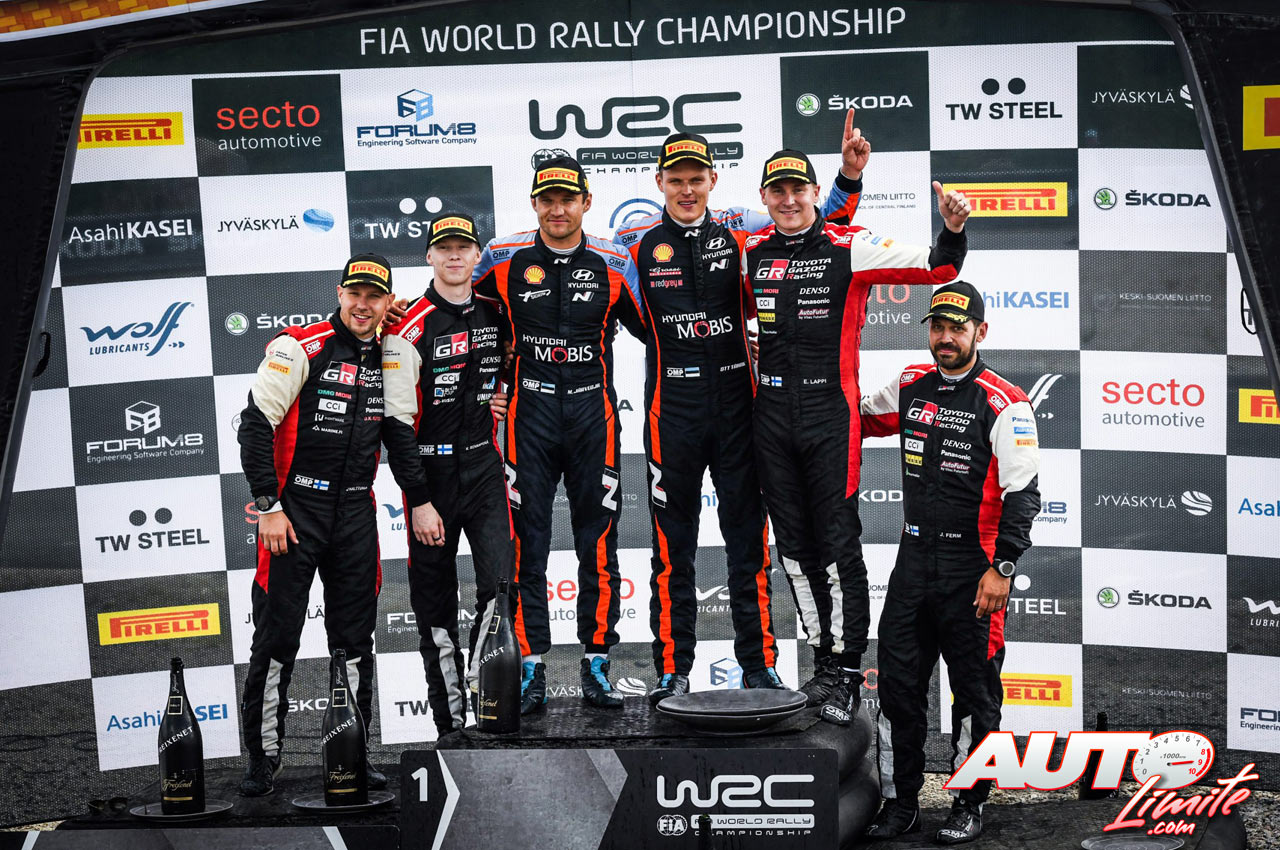Podio del Rally de Finlandia 2022, puntuable para el Campeonato del Mundo de Rallies WRC 2022. De izquierda a derecha: Jonne Halttunen y Kalle Rovanperä (Toyota), Martin Järveoja con Ott Tänak (Hyundai) y Esapekka Lappi junto a Janne Ferm (Toyota).