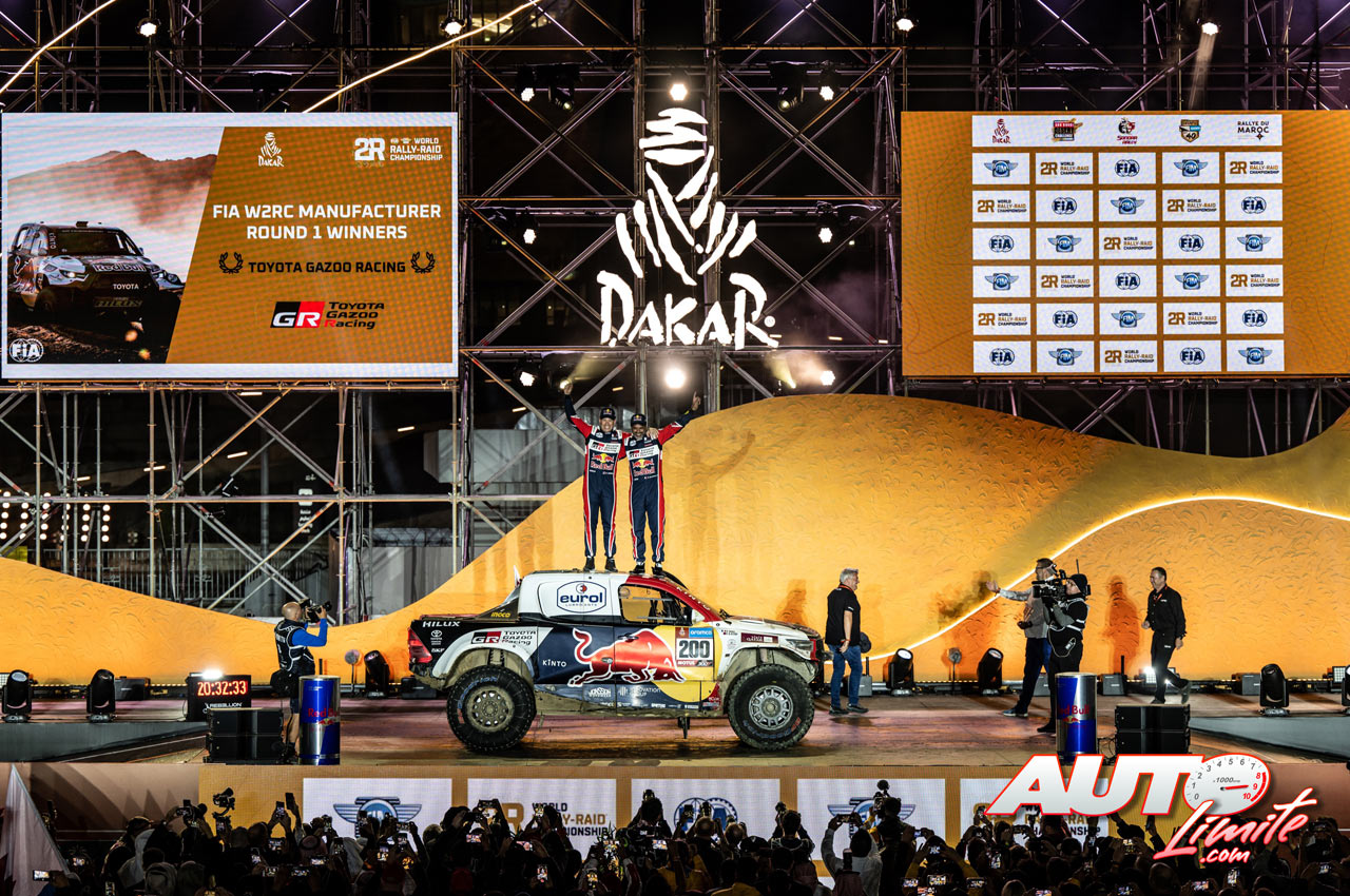 Nasser Al-Attiyah y Mathieu Baumel, sobre su Toyota GR DKR Hilux, celebrando la victoria en la categoría de coches en el podio del Rally Dakar 2023.