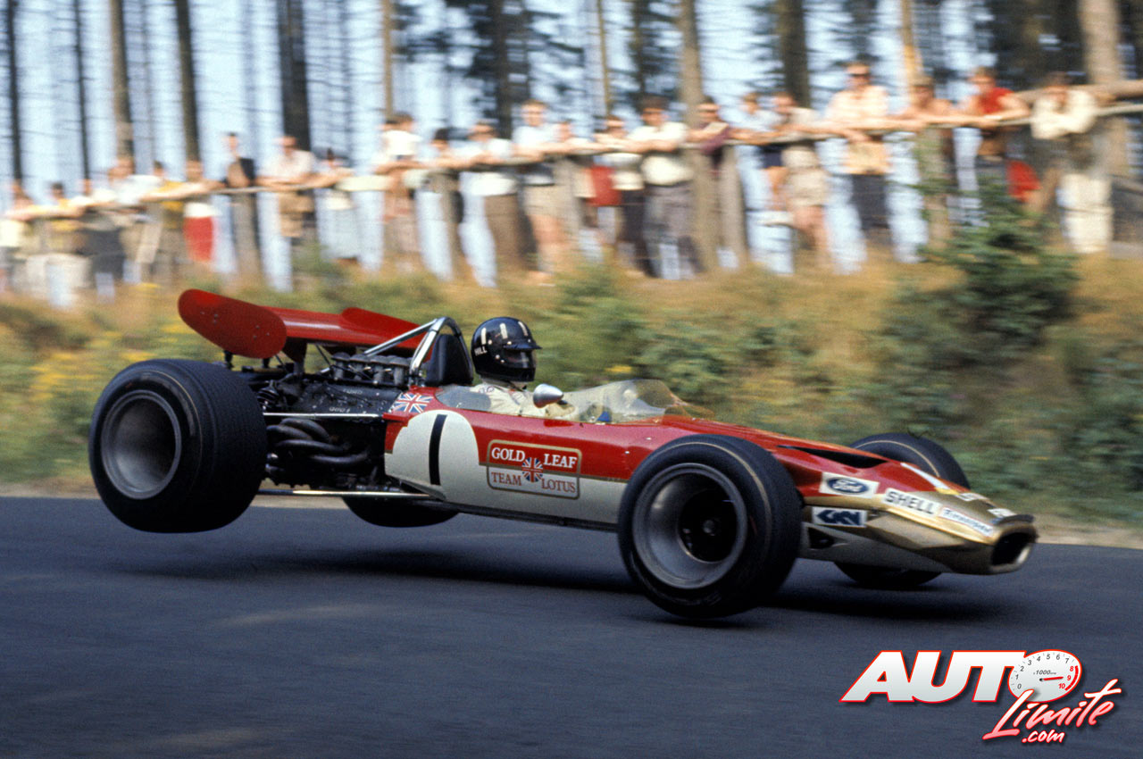 Graham Hill con el Lotus 49B en el circuito de Nürburgring-Nordschleife, durante el Gran Premio de Alemania de Fórmula 1 de 1969.