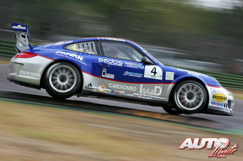 Porsche 911 GT3 Cup del equipo Ebimotors, pilotado por Vito Postiglione durante la prueba de la Carrera Cup Italia 2012 disputada en el circuito de Imola (Répública de San Marino).