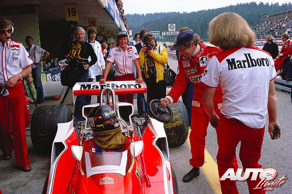 Niki Lauda bromea con James Hunt durante el GP de Austria de 1977.