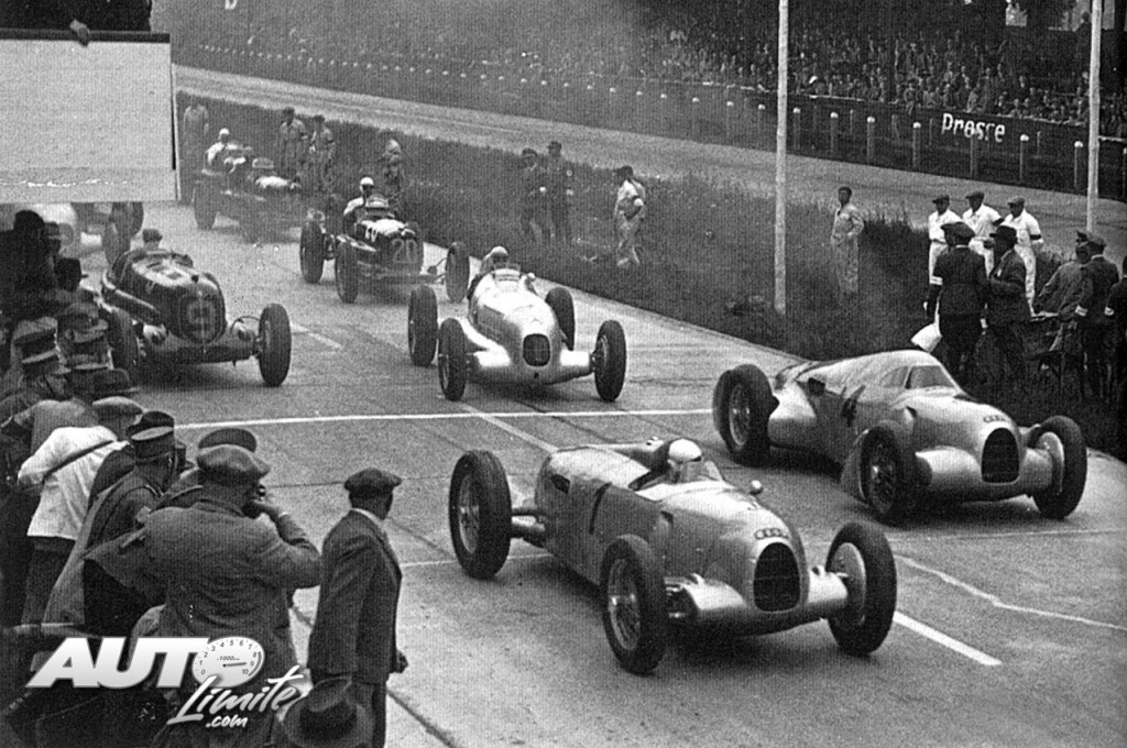 Salida del Grand Prix Avus-Rennen de 1935, con Hans Stuck (Auto Union Type B 4.9 V16 nº 1), Bernd Rosemeyer (Auto Union Type A 4.3 V16 Streamliner nº 4), Tazio Nuvolari (Alfa Romeo Bi-motore 6.3 nº 9), Luigi Fagioli (Mercedes W25 4.0 nº 7) y Giuseppe Farina (Maserati 4C 2.5 nº 20) ocupando las primera posiciones.