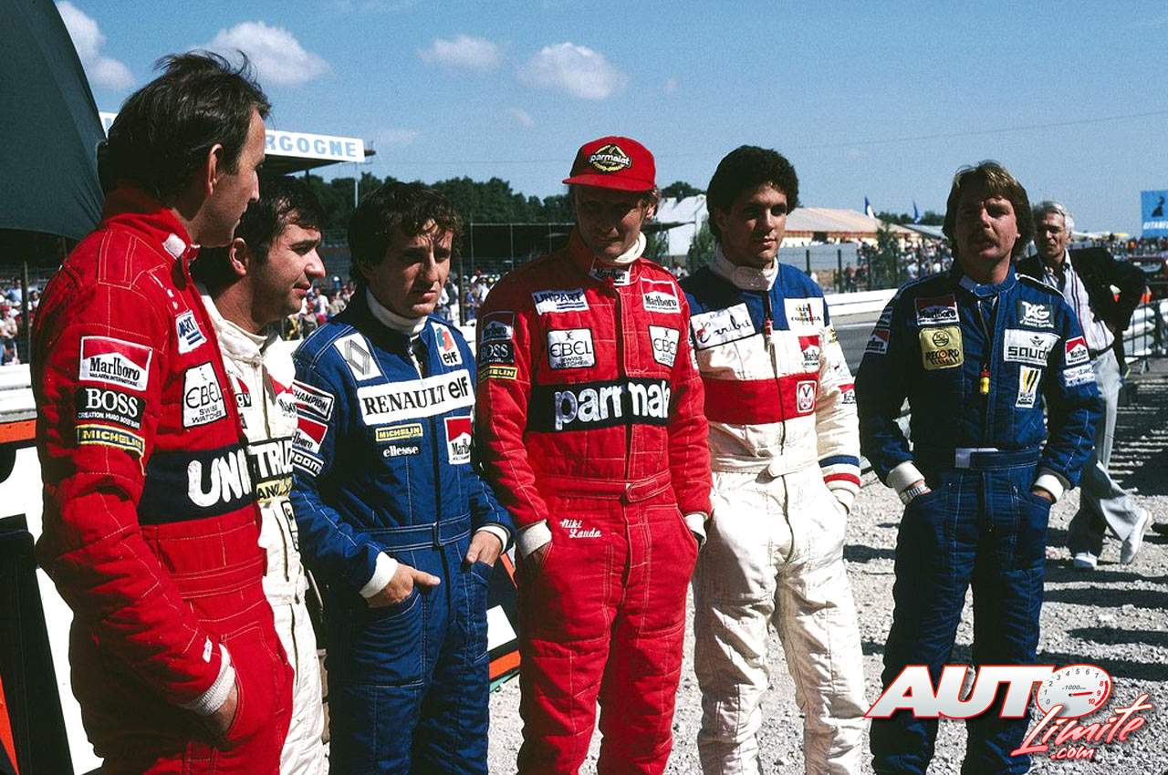 Niki Lauda con algunos pilotos más en el GP de Suiza de 1982, disputado en el circuito de Dijon-Prenois.