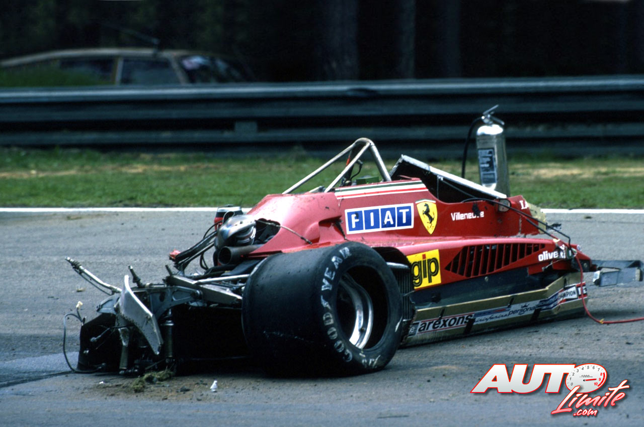El Ferrari 126 C2 de Gilles Villeneuve quedó completamente destrozado tras su accidente en los entrenamientos clasificatorios del GP de Bélgica 1982, disputado en el circuito de Zolder.
