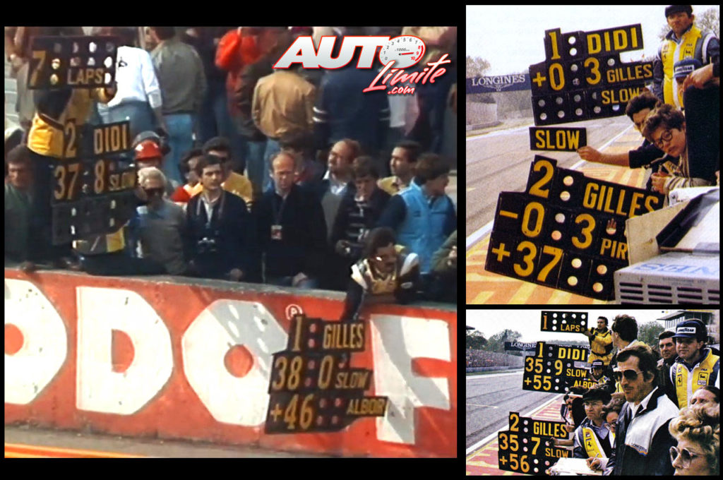 Las pizarras mostradas por el equipo Ferrari a sus pilotos durante el GP de San Marino 1982 dieron pie a una tremenda polémica. Las órdenes de equipo no fueron interpretadas igual por Gilles Villeneuve y por Didier Pironi (ganador de la carrera).