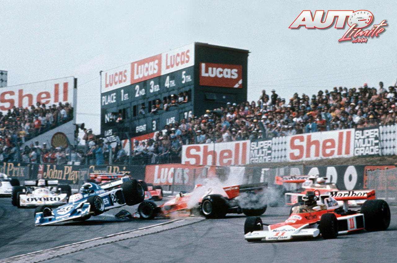 James Hunt (McLaren M23 nº 11), Clay Regazzoni (Ferrari 312 T2 nº 2) y Jacques Laffite (Ligier-Matra JS5 nº 26) se vieron envueltos en una colisión en la salida del GP de Gran Bretaña de 1976, disputado en el circuito de Brands Hatch.