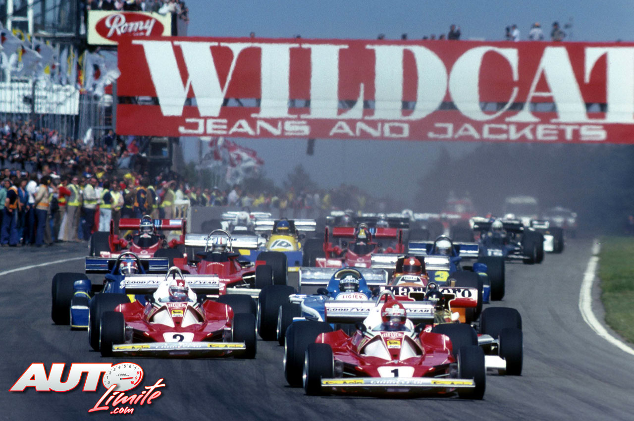 Salida del GP de Bélgica de 1976, disputado en el circuito de Zolder, con Niki Lauda (Ferrari 312 T2) comandando la carrera, seguido por James Hunt (McLaren M23) y Clay Regazzoni (Ferrari 312 T2 nº 2).
