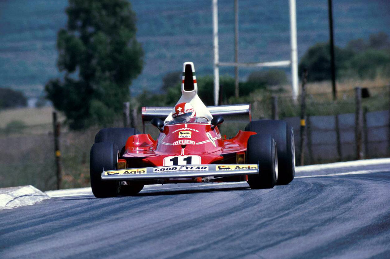 Clay Regazzoni con el Ferrari 312 T en el circuito de Kyalami, durante el GP de Sudáfrica de 1975.