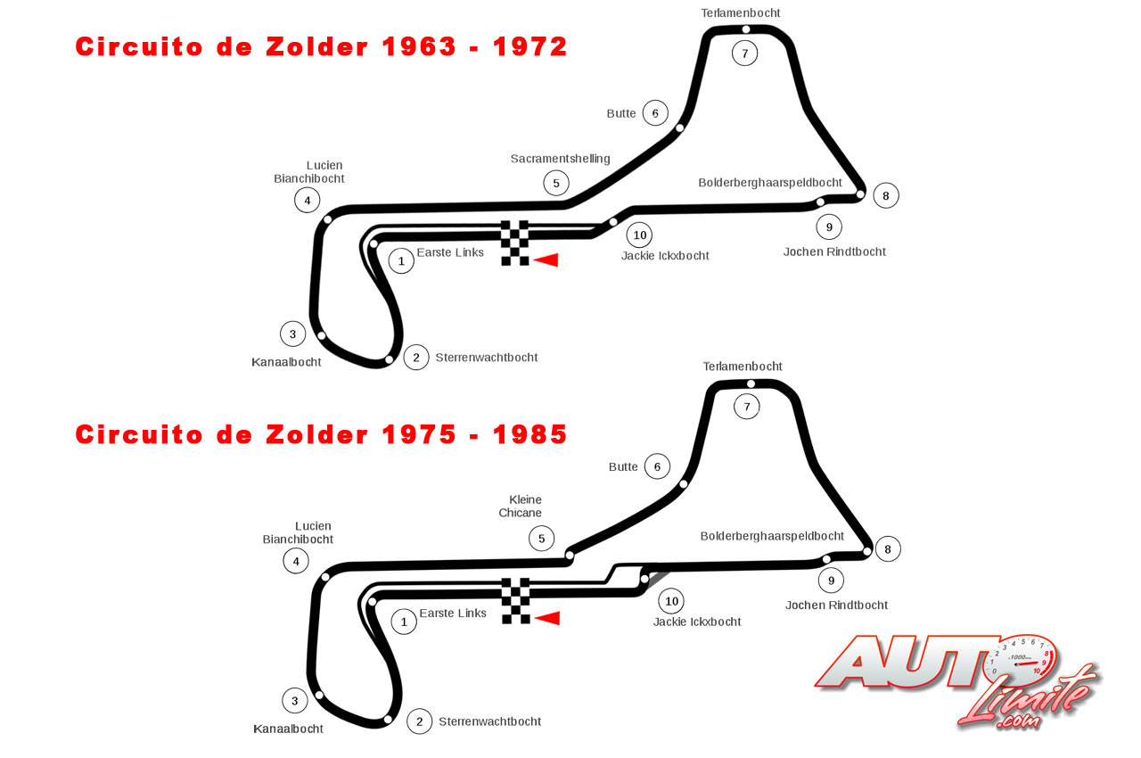 Comparación de los cambios realizados en el trazado del circuito de Zolder (Bélgica) entre 1963 y 1985.